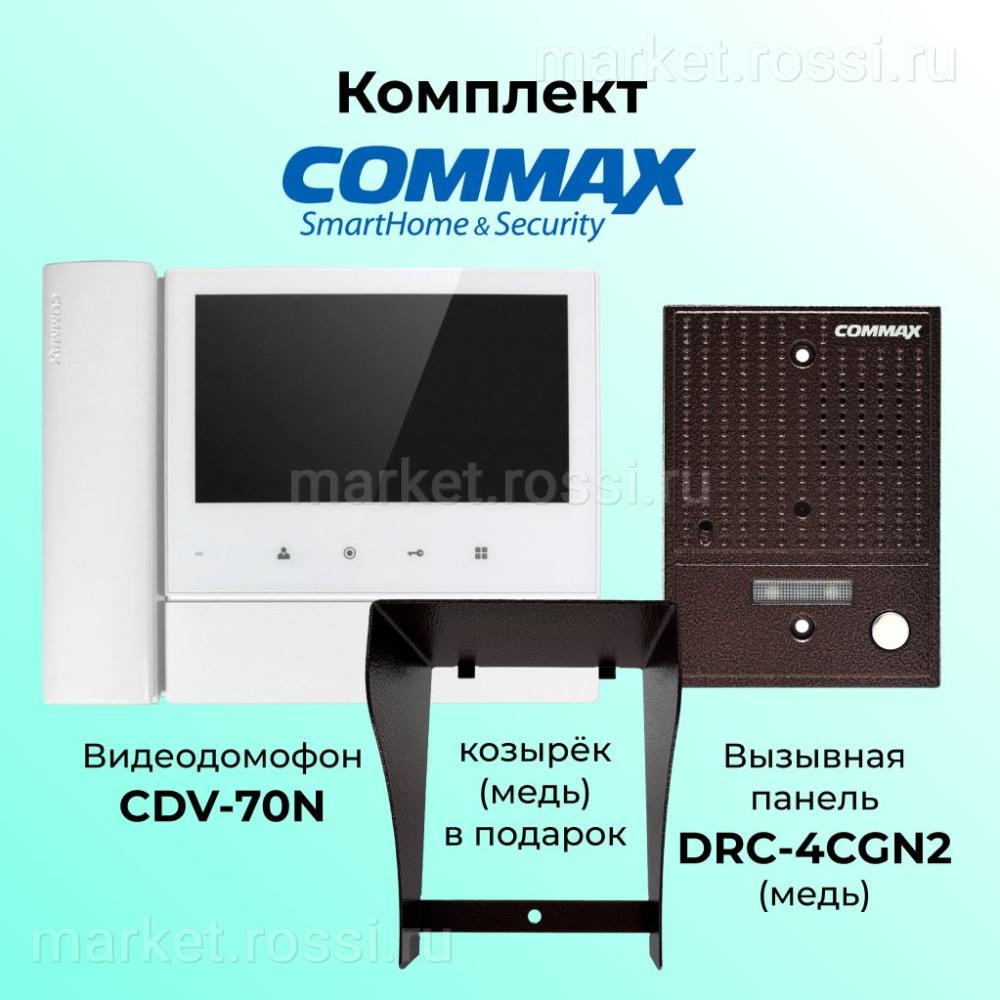 Комплект видеодомофона и вызывной панели COMMAX CDV-70N (белый)/DRC-4CGN2(медь)+Козырек — это современное решение для вашего дома или офиса