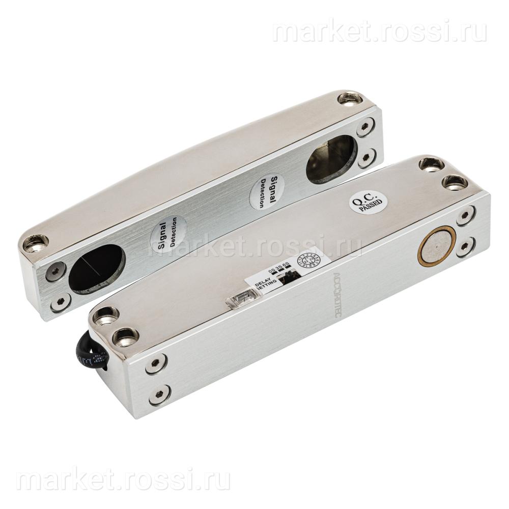 Соленоидный замок со встроенным датчиком состояния двери; накладной; двухцветная светодиодная индикация; питание 12В; потребляемый ток в режиме ожидания 110мА, при пуске 1А; тип замка НО; нержавеющая сталь; латунная втулка