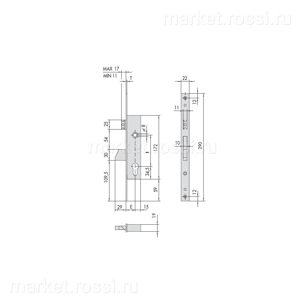 - Имеется три модификации замка, отличающиеся расстоянием от торца до оси цилиндра: Е=25/30/35 мм