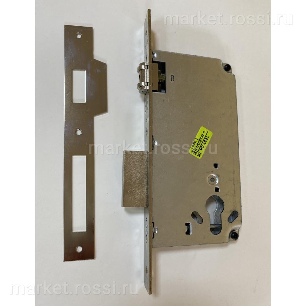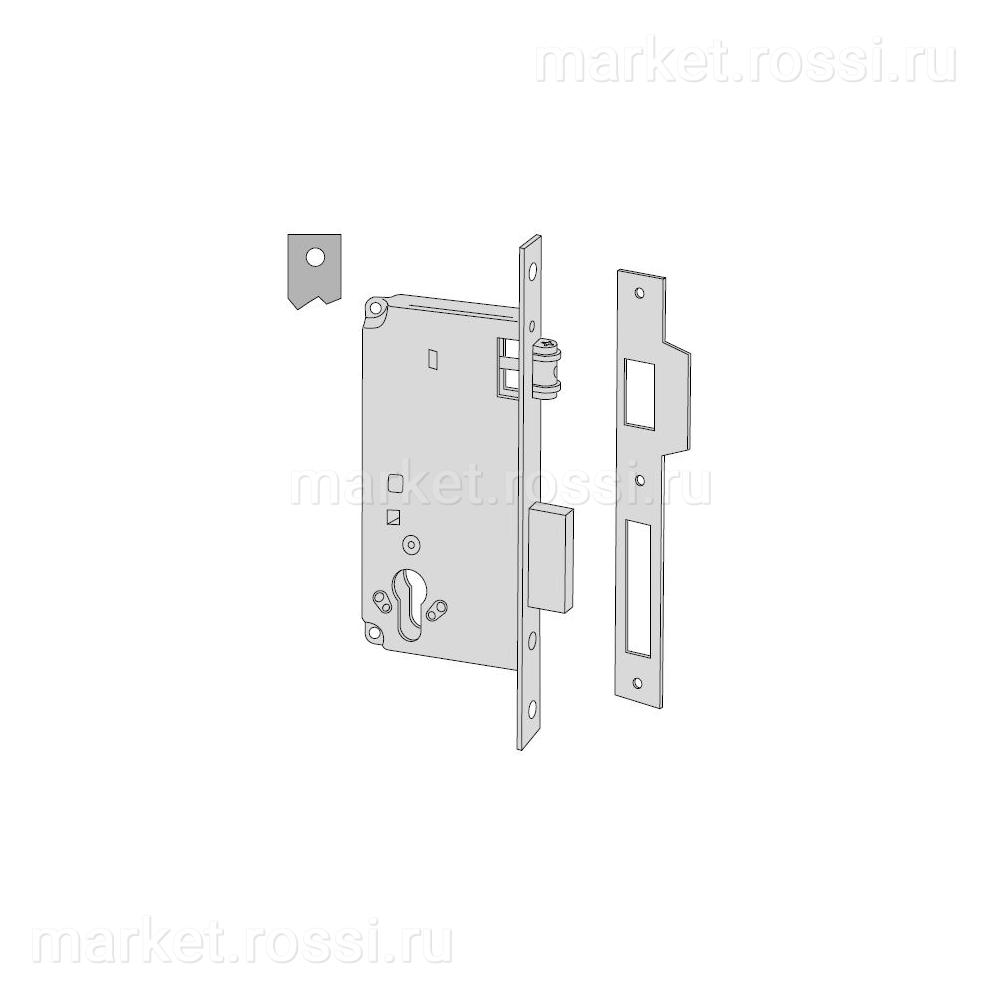 - 12 Замок врезной цилиндровый, 2 оборота, 1 плоский ригель, роликовая защелка, хром